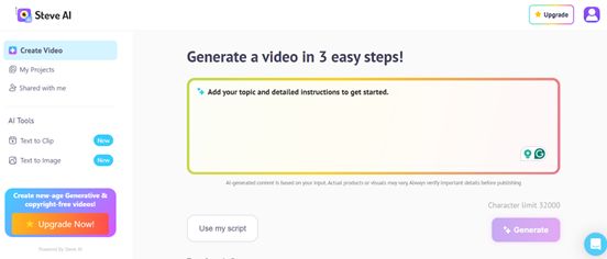 Steve.AI is an AI-based system that focuses on the production of animated and live-action videos based on basic text prompts or scripts. It is a great explainer video, lesson, and social storytelling tool.